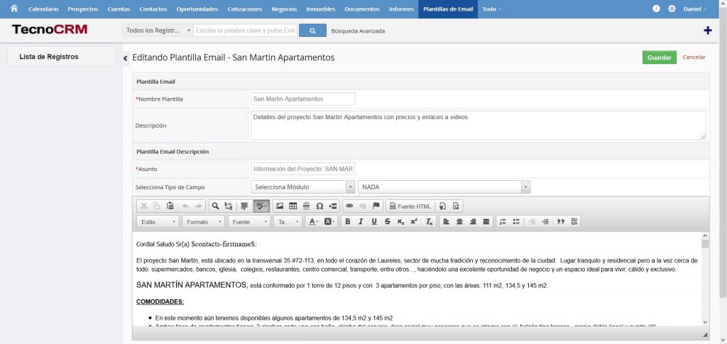 Haga clic en [Guardar] para transferir su plantilla al sistema TecnoCRM.