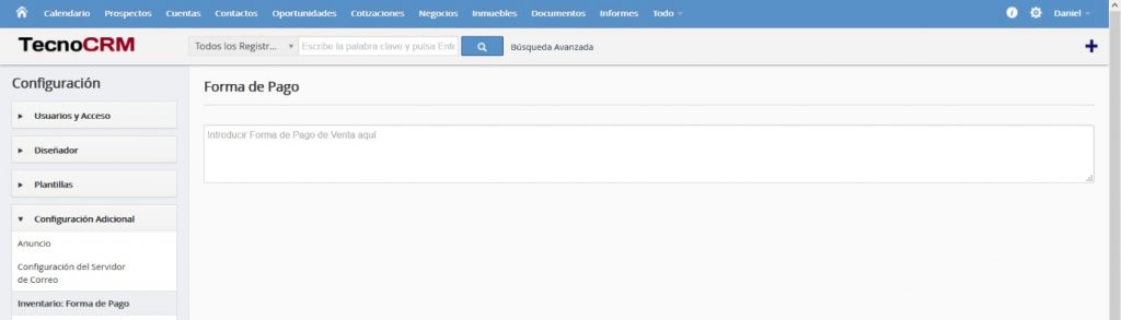 Usted puede almacenar sus condiciones predeterminadas de venta en TecnoCRM. Haga clic en [Editar] en el menú Inventario – Condiciones Generales.