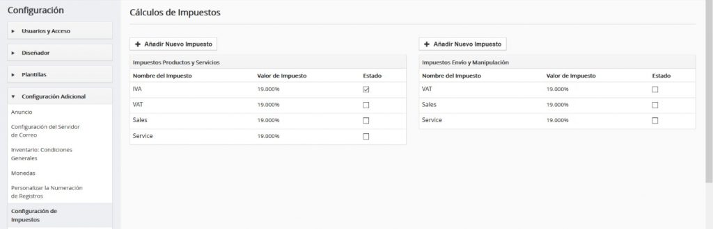 Para agregar nuevos impuestos use el botón [Añadir Impuesto]. Puede definir tantos impuestos adicionales como los necesite. Coloque sus impuestos en porcentaje (%). Observe que usted no puede borrar los impuestos predeterminados del sistema TecnoCRM. Sin embargo, puede desactivar los impuestos innecesarios haciendo clic en la casilla apropiada.