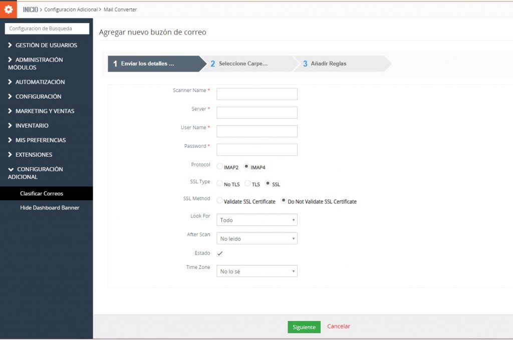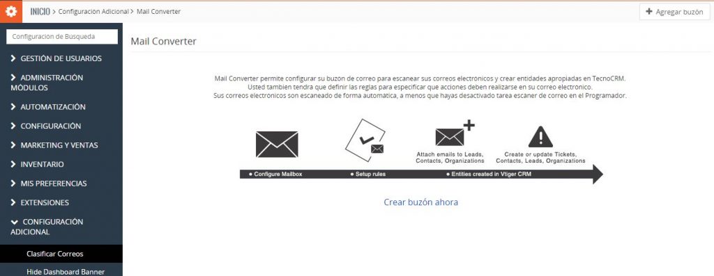 Configuración del CRM > Configuración Adicional > Clasificar Correos > Crear Buzón Ahora
