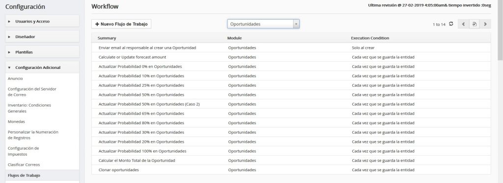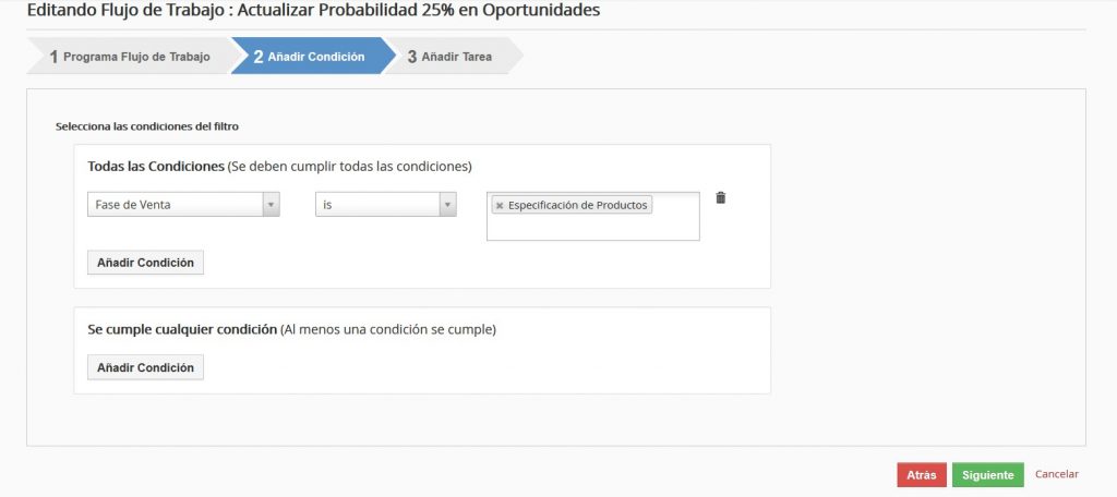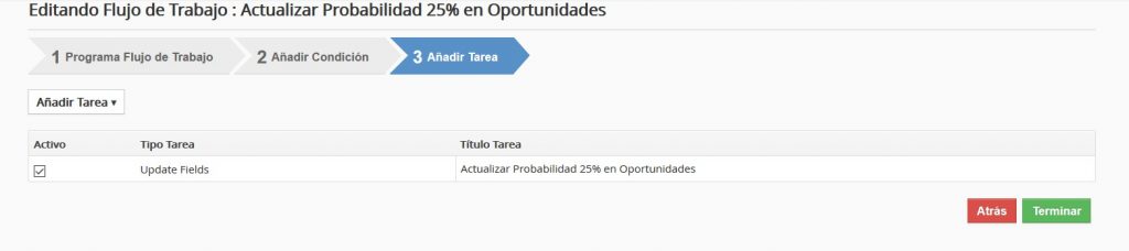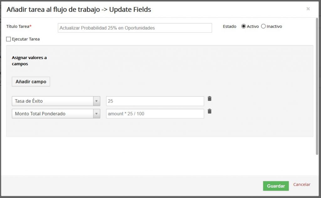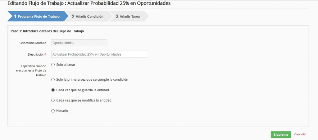 Como ejemplo, a continuación vamos a mostrar la configuración de un Flujo de Trabajo que actualiza el Porcentaje de la Probabilidad de las Oportunidades colocándolo en 25% bajo ciertas condiciones del Ciclo de Venta: