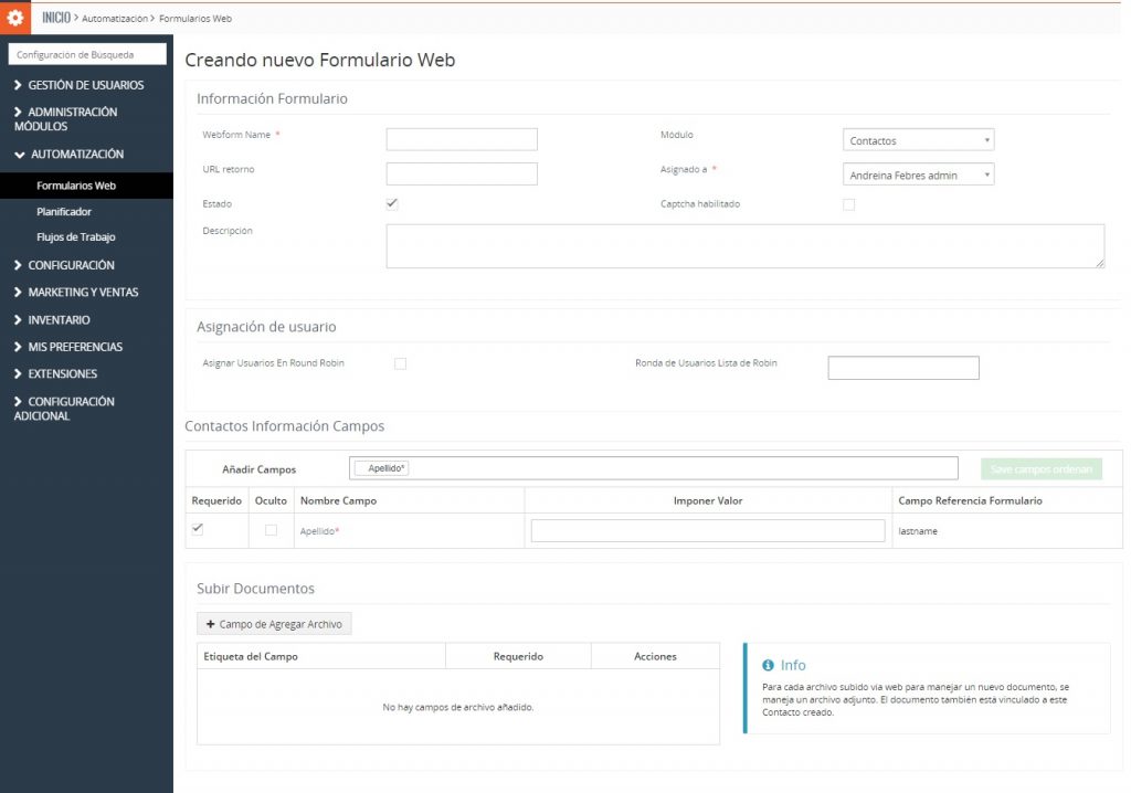 TecnoCRM permite generar formularios cuyo código fuente puede ser insertado en sitios o portales web para capturar datos que son ingresados automáticamente en el módulo correspondiente del CRM.