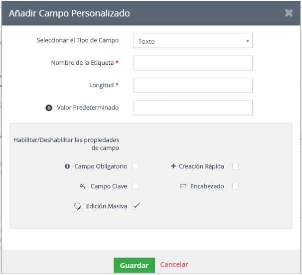 Usted puede configurar sus propios campos de entrada para la mayor parte de los módulos de TecnoCRM. Si usted quiere crear tales campos personalizados vaya al menú Campos Personalizados. Dependiendo del módulo de TecnoCRM seleccionado, el menú muestra los campos personalizados existentes.