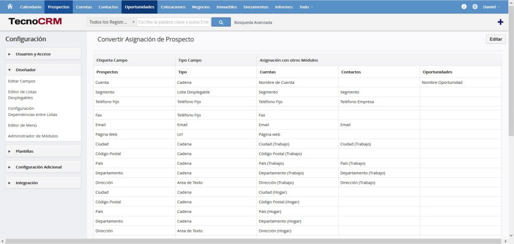 2. Una pantalla se abrirá mostrado el mapa de campos de los Prospectos, Cuentas, Oportunidades y Contactos.