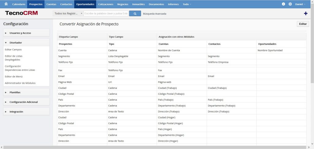 - Una pantalla se abrirá mostrado el mapa de campos de los Prospectos, Cuentas, Oportunidades y Contactos.
