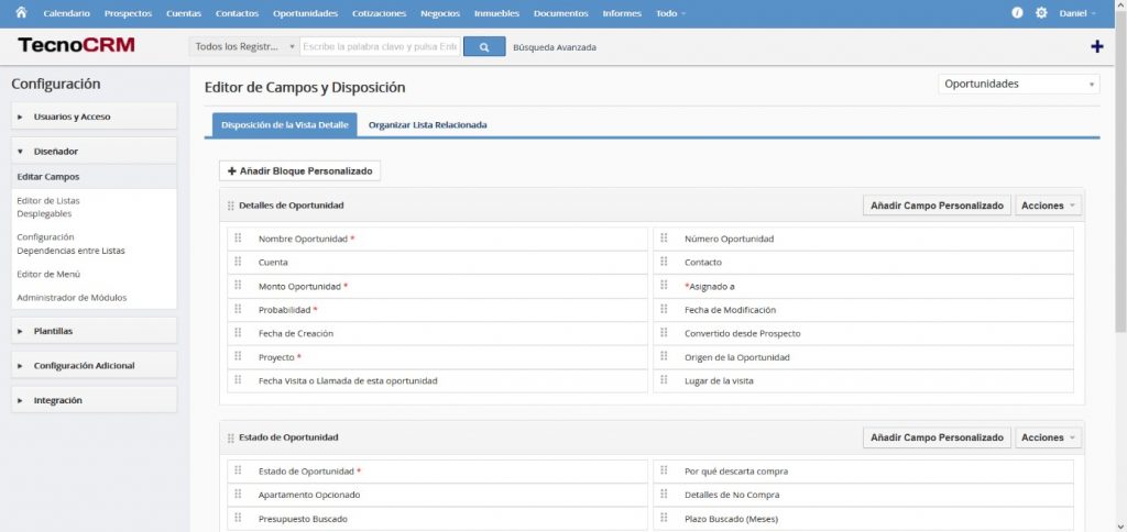 El Editor de Campos permite que usted modifique sus datos para sus requisitos particulares principales y que modifique el contenido de las listas de selección en cada módulo individual según lo explicado en las secciones siguientes.