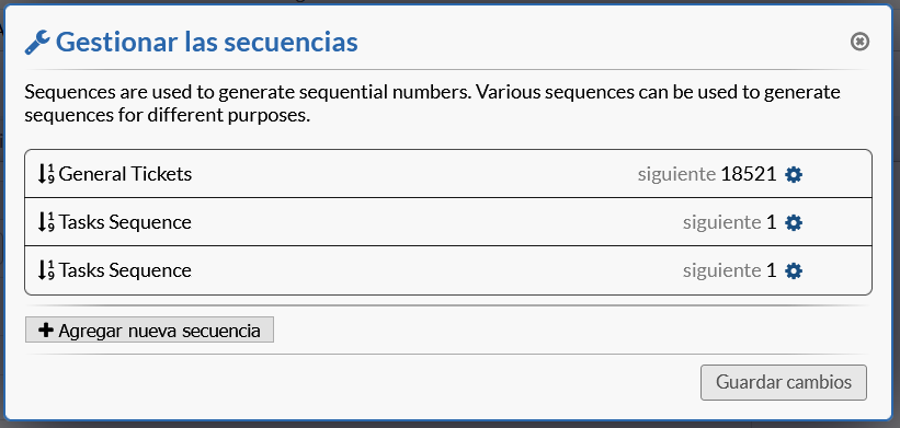 Secuencia de número de ticket predeterminada: elija entre números aleatorios o secuenciales para los tickets. Para crear nuevas secuencias, haga clic en el botón Administrar en el extremo derecho del campo.