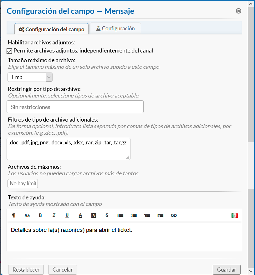 - Limitaciones de archivos adjuntos: permite la configuración de tipos específicos de archivos adjuntos si es necesario.