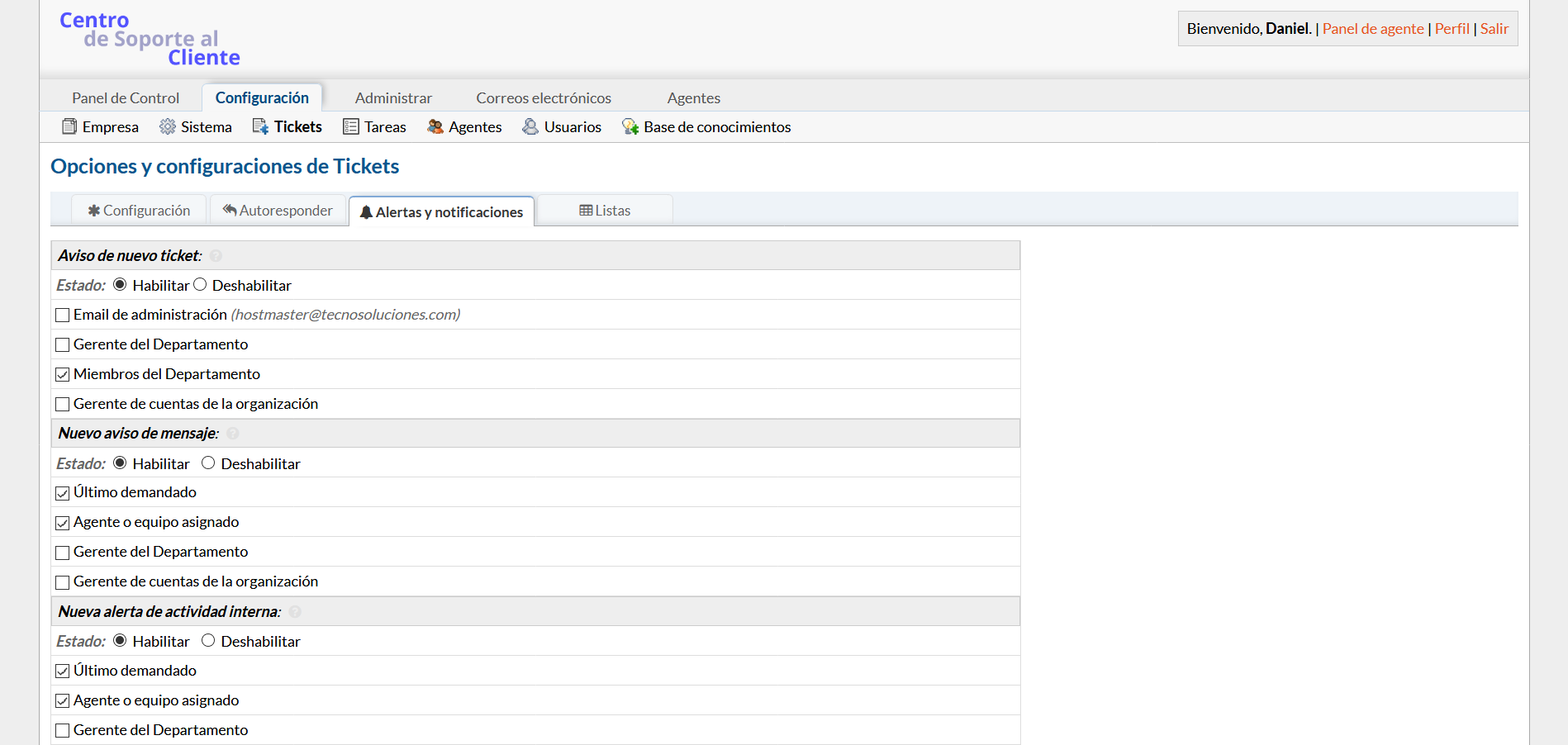 - Alerta de ticket nuevo: Alerta enviada a los agentes cuando se crea un ticket nuevo.