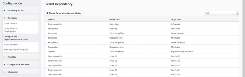 Para configurar las listas dependientes debe ingresar en la opción Configuración Dependencias entre Listas