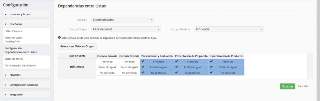 Como se puede observar, primero se selecciona el Módulo relacionado, luego el Campo Origen a partir de las listas de selección existentes para dicho módulo, luego el Campo Destino con otra de las listas de selección existentes y finalmente se seleccionan los valores dependientes en forma de matriz.