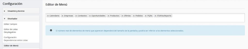 A través de esta herramienta es posible definir los módulos que se desean mostrar en el menú principal mientras que los módulos activos que no se escojan se verán dentro del menú Todos.