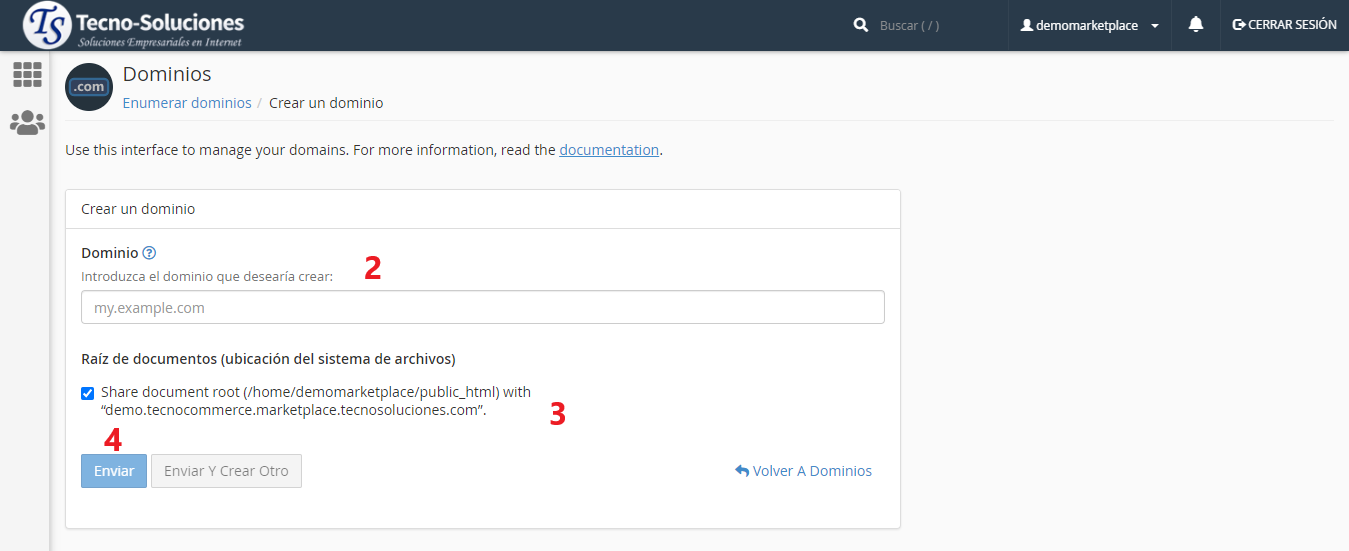 Para crear un nuevo dominio, ingrese el nuevo nombre de dominio. Por ejemplo