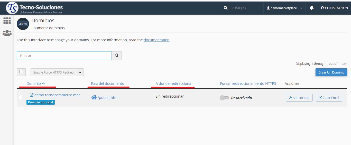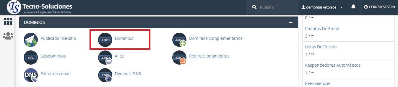 Esta interfaz enumera sus dominios.