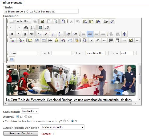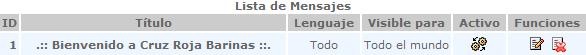 Este Módulo muestra inicialmente el listado de los mensajes creados. El portal CRUZROJABARINAS.COM.VE tiene configurado un Mensaje.