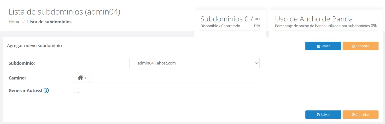 Agregar SubDominio , seleccione el Dominio al que se le asignará, Ruta , si desea modificar la ruta del SubDominio, haga clic en el icono de la casa, agregue o no el certificado SSL y haga clic en Guardar .