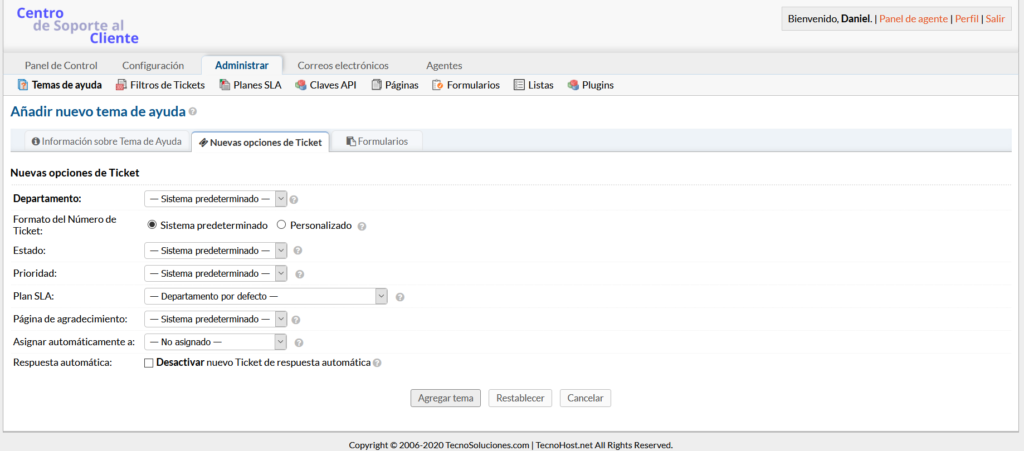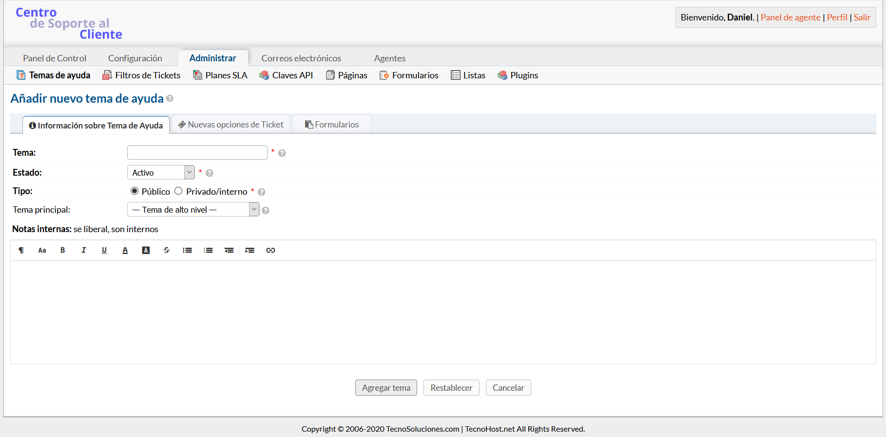- Tipo: si el tema se selecciona como “Privado”, solo será visible cuando un agente cree un ticket internamente desde el Panel de control del personal (Panel del agente> Tickets> Nuevo ticket).