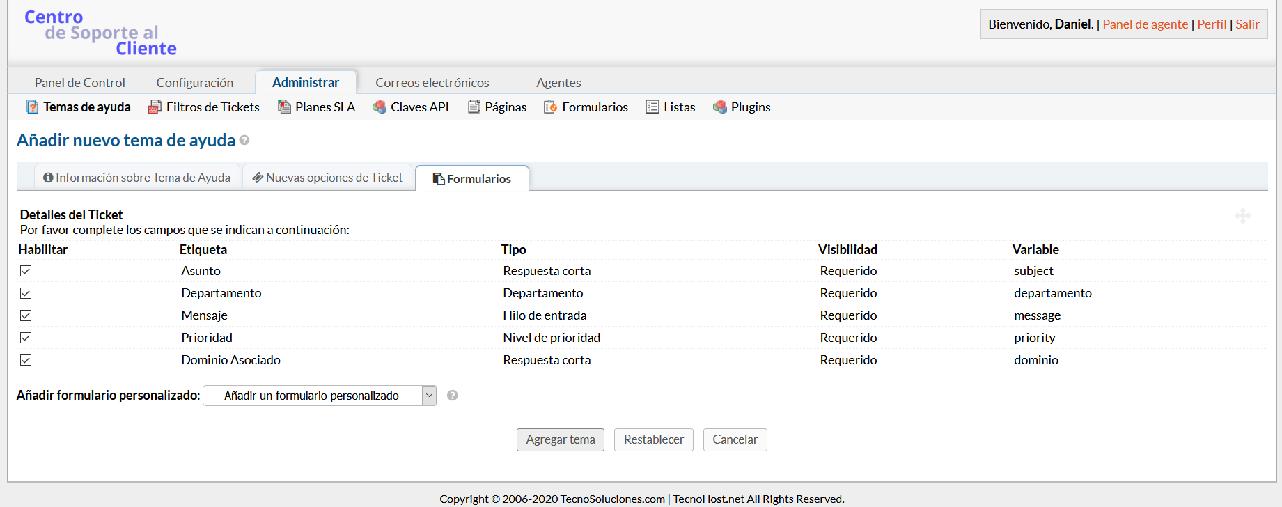 Formulario personalizado: información adicional para tickets asociados con este tema de ayuda. Los formularios personalizados se pueden crear en el Panel de administración > Administrar> Formularios. Los campos del formulario aparecerán una vez que se seleccione el tema de ayuda.