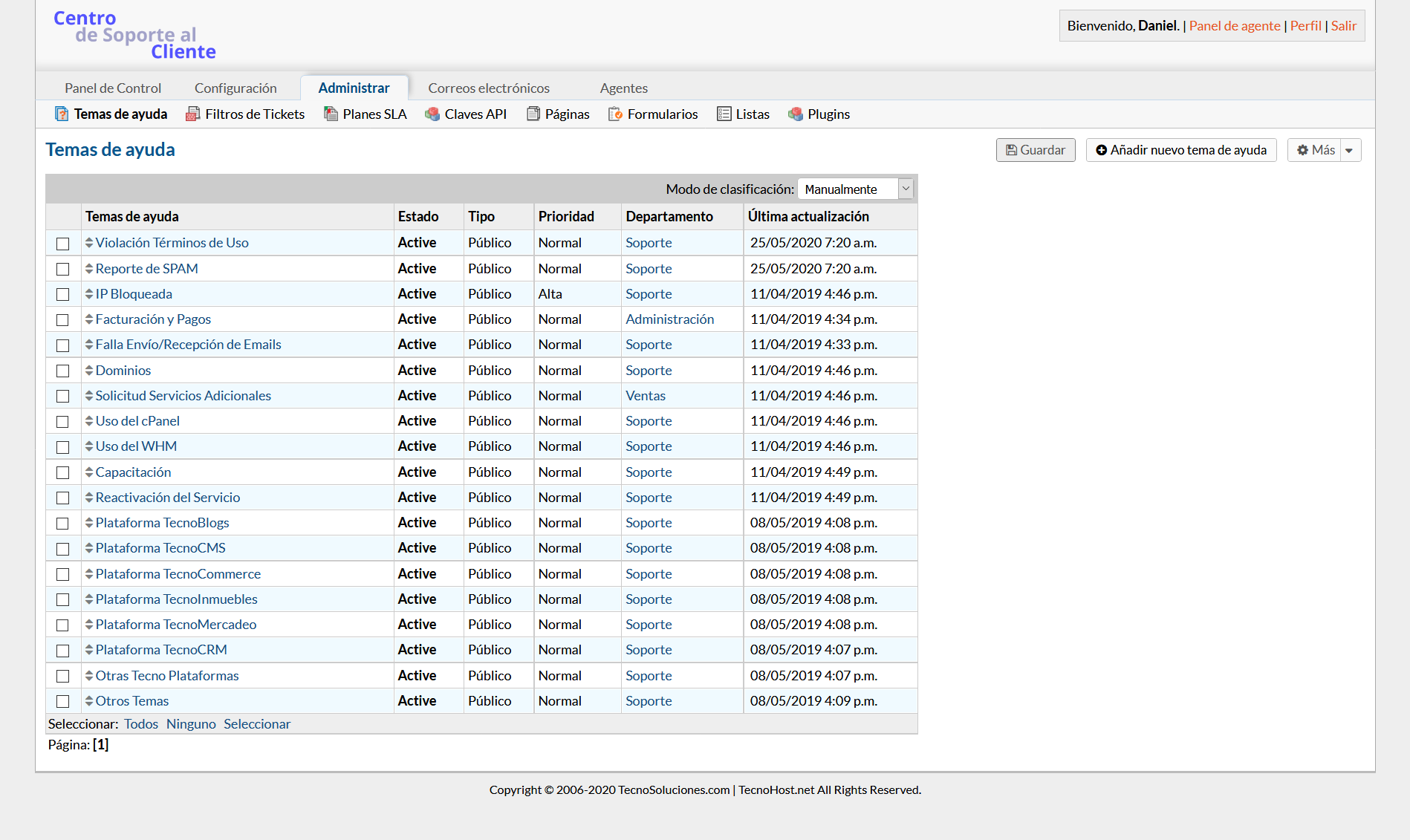 Panel de administración > Administrar> Temas de ayuda:
