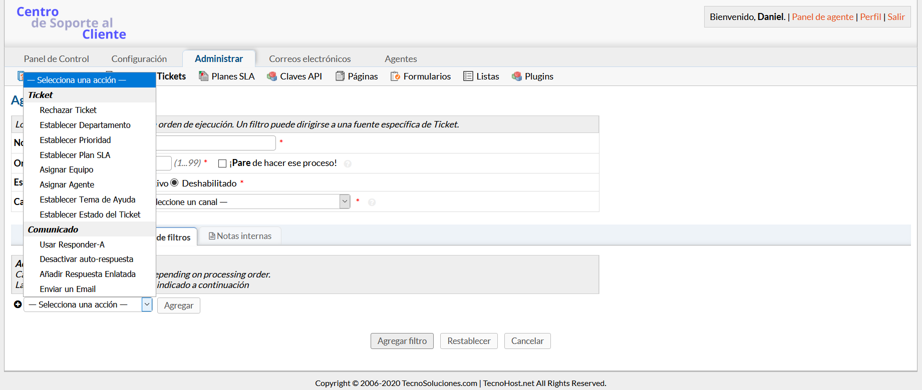 - Establecer estado: esto determinará el estado del ticket una vez creado si se cumplen las reglas de filtrado.