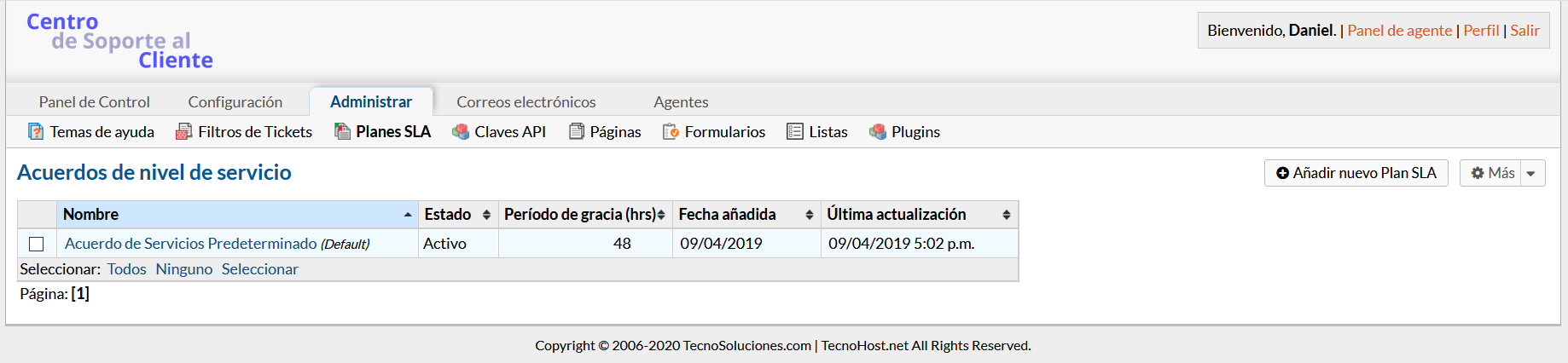 Panel de administración > Administrar > SLA (acuerdos de nivel de servicio)