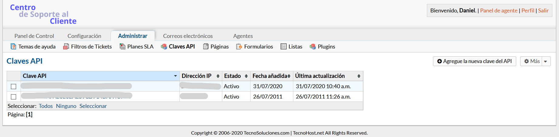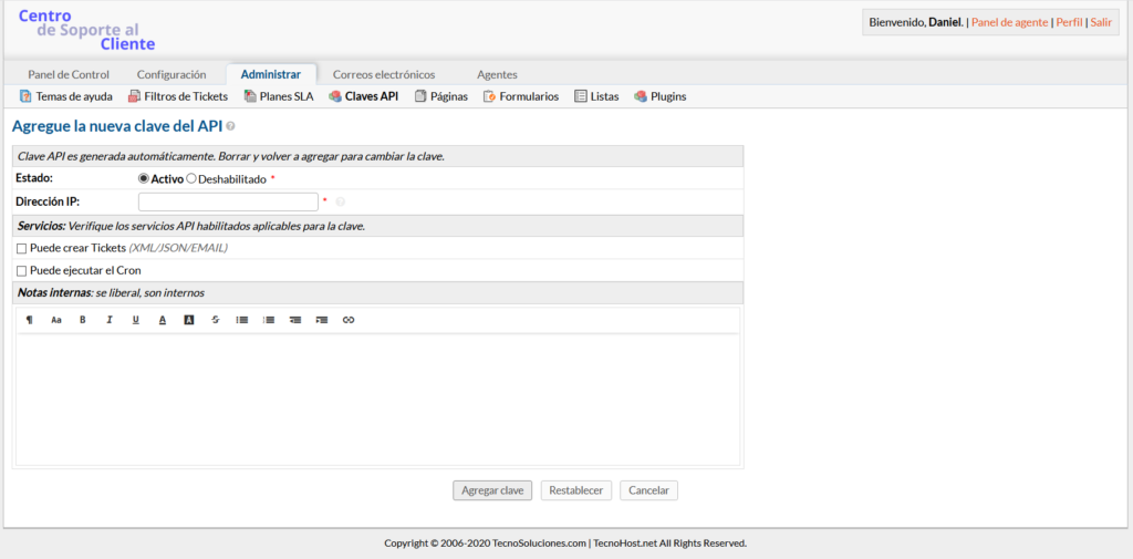 La siguiente imagen es la página de información donde se puede ingresar y agregar una clave API. En esta página, la clave API se puede configurar como Activa o Desactivada, la dirección IP del servidor que aloja el software. Luego, los servicios de Crear Ticket y Cron se pueden habilitar para la clave. Finalmente, se puede insertar una nota interna para anotar el motivo de esta clave.