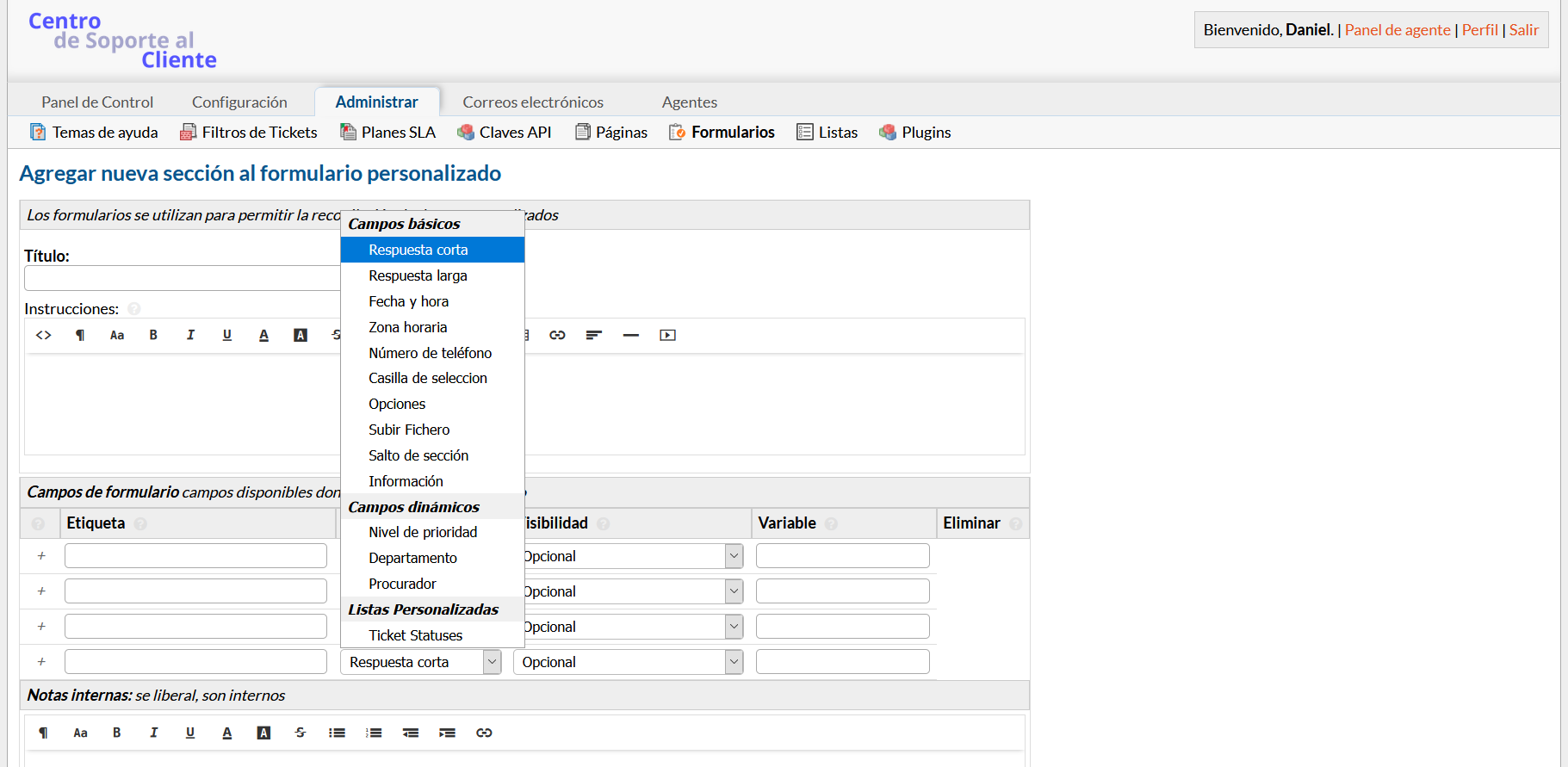 - Listas personalizadas: Primero debe CREAR una Lista personalizada en Panel de Administración > Administrar> Listas antes de que aparezca en el campo “Tipo“.