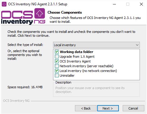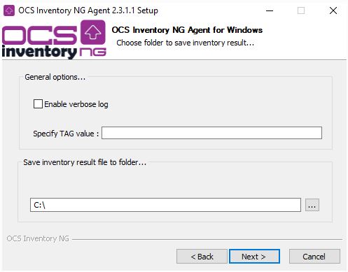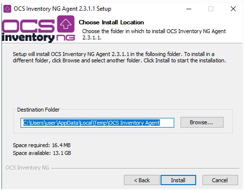 Por ejemplo, puede utilizar OCS-NG-Windows-Agent-Setup.exe/S/LOCAL=C:\ para generar silenciosamente el archivo de inventario “.ocs” en la carpeta c :.