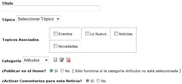 Este es el módulo que permite añadir un nuevo artículo al módulo de Noticias. Ofrece diversas opciones para su configuración, que se analizan a continuación: