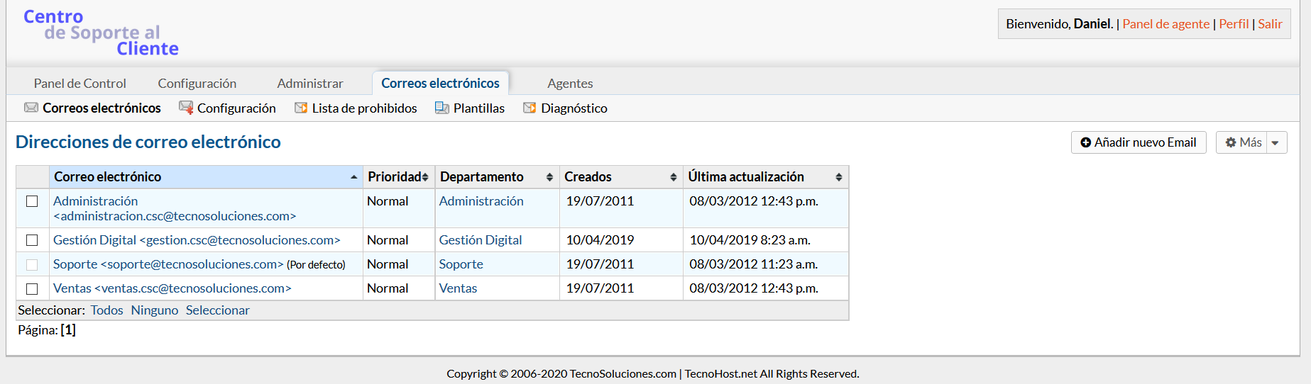 Se puede enrutar un número ilimitado de direcciones de correo electrónico a través de la mesa de ayuda. Puede configurar los ajustes de IMAP o POP para un correo electrónico para que el sistema pueda recuperar el correo del buzón y crear tickets. También puede configurar la configuración SMTP para un correo electrónico para que el sistema pueda enviar correo desde la dirección. Se pueden configurar configuraciones adicionales para cambiar ciertas cosas en los Nuevos Tickets que se obtienen de la dirección.
