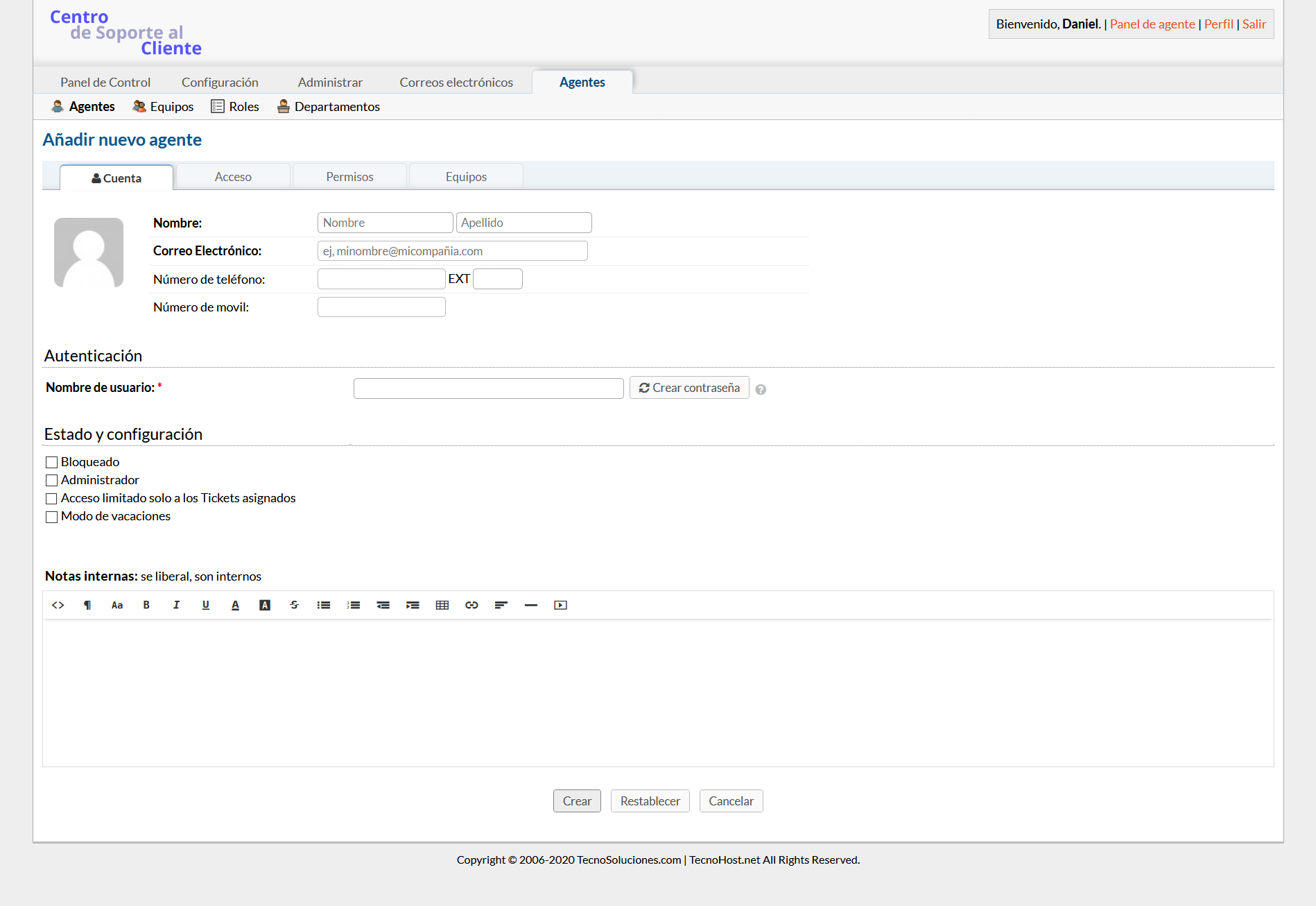 Los agentes tienen acceso a la mesa de ayuda con la intención de responder y resolver los tickets. Al agregar un agente a la mesa de ayuda, será necesario asignarlo a un departamento principal y asignarle una función principal para los tickets / tareas enrutados a ese departamento. Los agentes pueden tener acceso extendido a departamentos adicionales de la mesa de ayuda, así como también se les pueden asignar diferentes roles a esos departamentos; esto se puede configurar en la pestaña Acceso del Perfil del Agente.