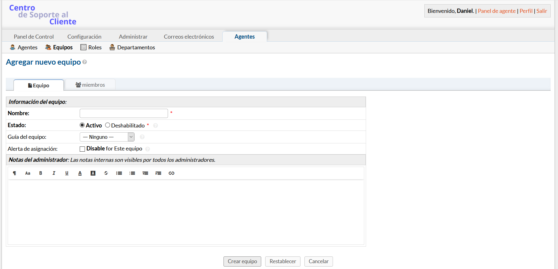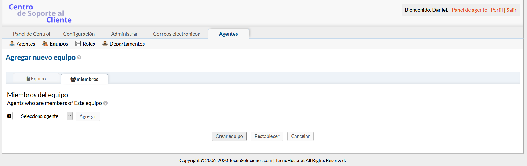 Para crear un equipo en su Panel de administración, busque la pestaña Agentes y haga clic en Equipos. Luego, haga clic en Agregar nuevo equipo a la derecha y complete la información correspondiente. Luego, podrá agregar agentes al equipo haciendo clic en su nombre de su lista de agentes y marcando la casilla correspondiente junto al nombre del equipo que desea agregar en la parte inferior de la página.