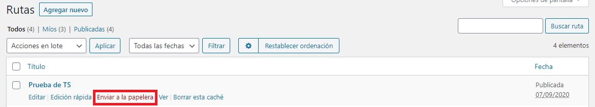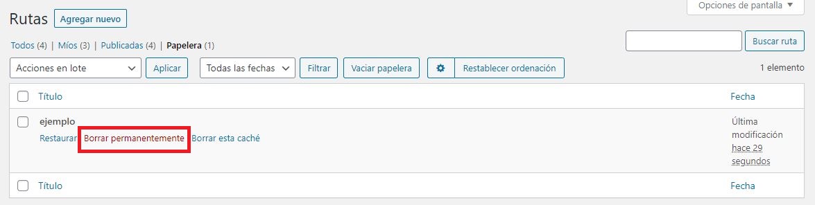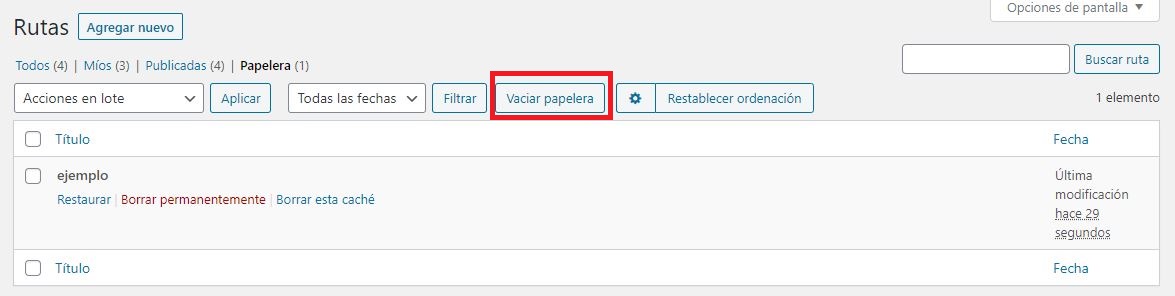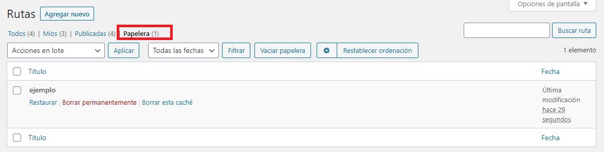Para ver la Papelera le damos clic al botón que lleva su nombre en las opciones que aparecen al lado del buscador. Una vez que le damos clic mostrara todas las rutas que se encuentran dentro de la papelera.