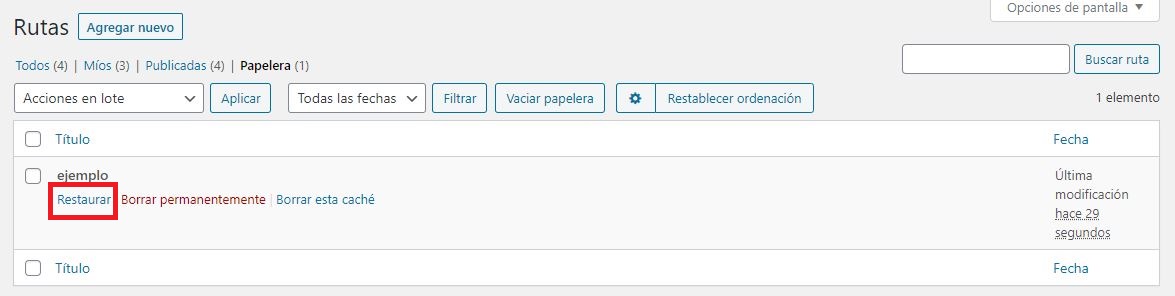 También podemos restaurar las rutas posicionando el cursor sobre las rutas eliminados para observar las opciones y darle clic donde dice Restaurar.