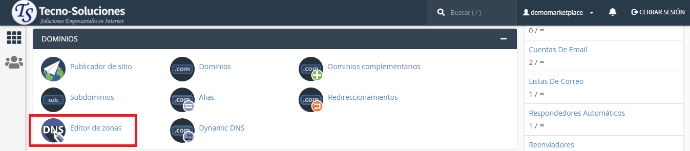 - Editor de zona (AAAA, CAA, SRV, TXT)