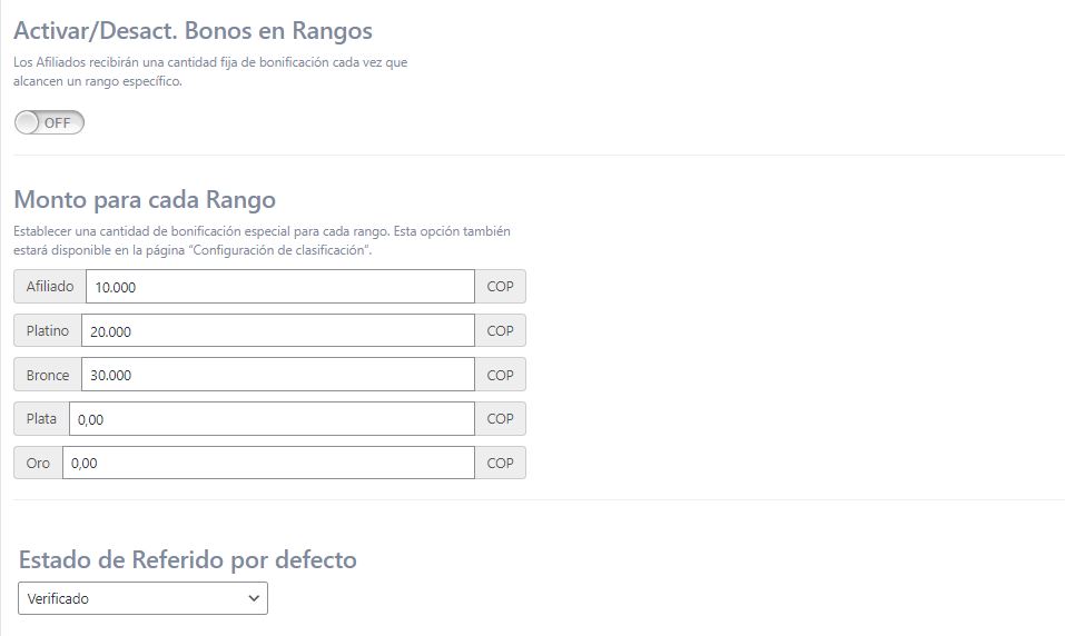 Ejemplo: Puede configurarlo para que sus afiliados recién registrados reciban 10.000 COP. Para hacer esto, simplemente establezca la cantidad de bonificación especial para el primer rango en la cantidad que desee en su moneda, en este caso 10.000 COP.