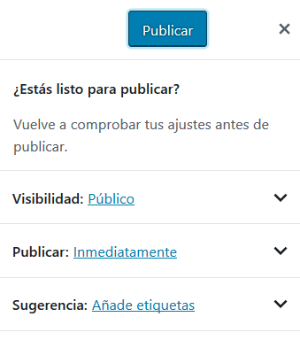 - Publicar: Permite publicar la entrada y pide confirmación antes de hacerlo para no publicar por accidente una entrada que solo quiera guardar como borrador.
