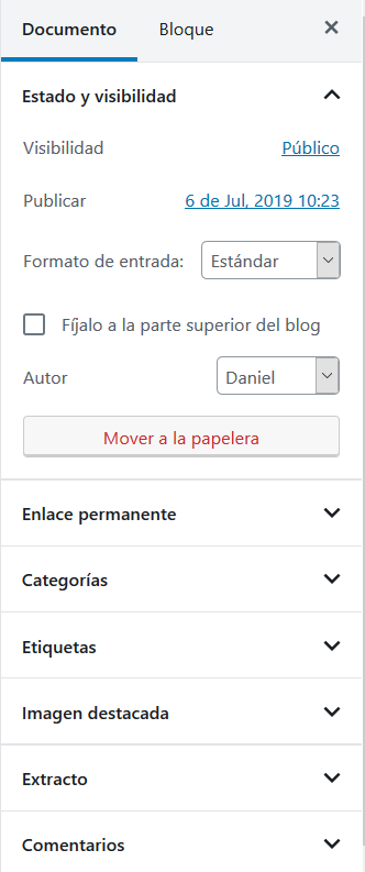 👉 Documento. Contiene las opciones generales de la entrada al igual que el editor clásico.