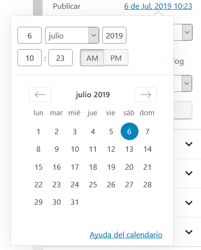 - Fecha de publicación: La manera de programar una entrada se realiza a través de un calendario desde el cual se elige visualmente el día de publicación y asignar un horario.