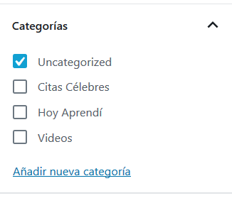 - Categorías: Permite clasificar las entradas en una estructura de categorías. Es posible asignarla a una categoría existente o agregar nuevas categorías.