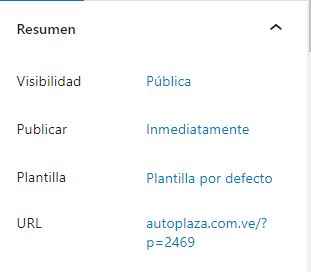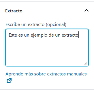 - Extracto: Permite asignar un texto de extracto a ser usado en el resumen de cada entrada normalmente mostrado bajo la opción Blog del portal web en lugar de mostrar el primer párrafo interno de dicha entrada.