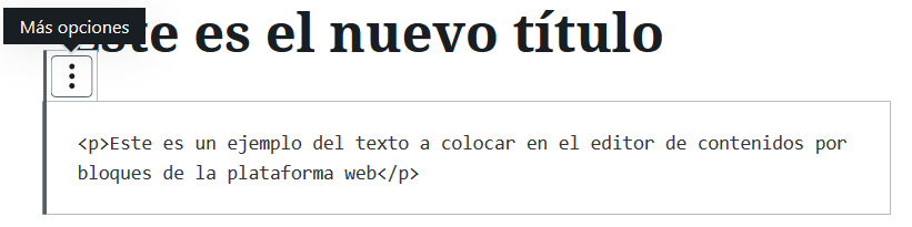 👉 La primera es accediendo al código de un bloque en particular. Esto lo conseguimos haciendo clic en los tres puntos que aparecen a la derecha de un bloque (en la barra de herramientas), cuando estamos trabajando en él, y luego en la opción Editar como HTML.