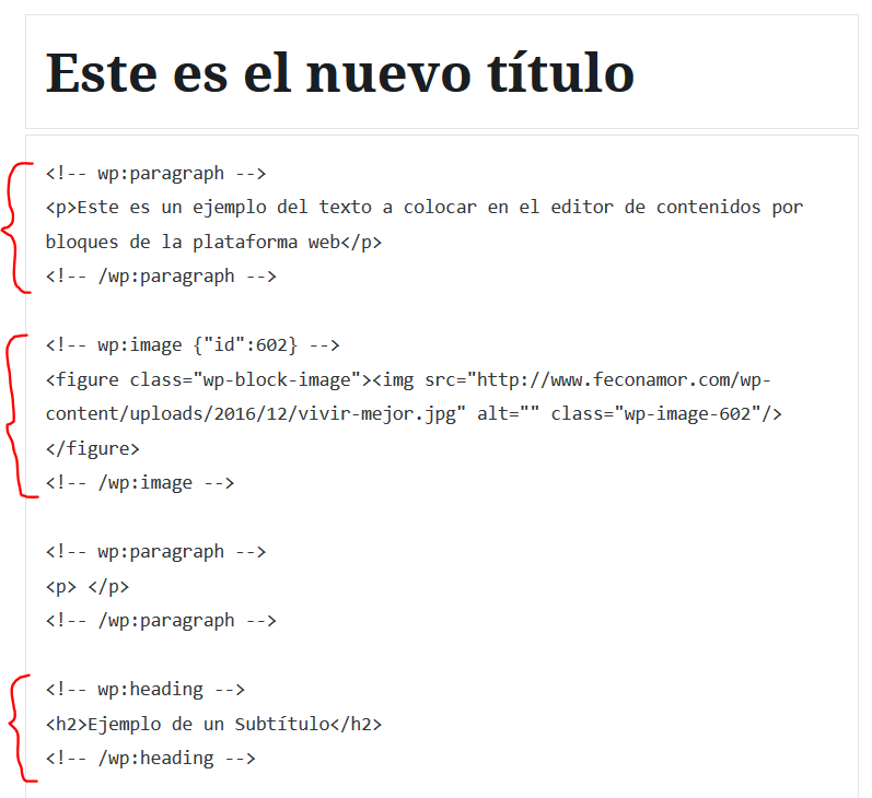 A diferencia de otros editores por bloques, este editor no utiliza códigos cortos (shortcodes), sino etiquetas de comentario HTML para definir cada bloque del contenido y clases especiales para el formato, como podemos ver a continuación