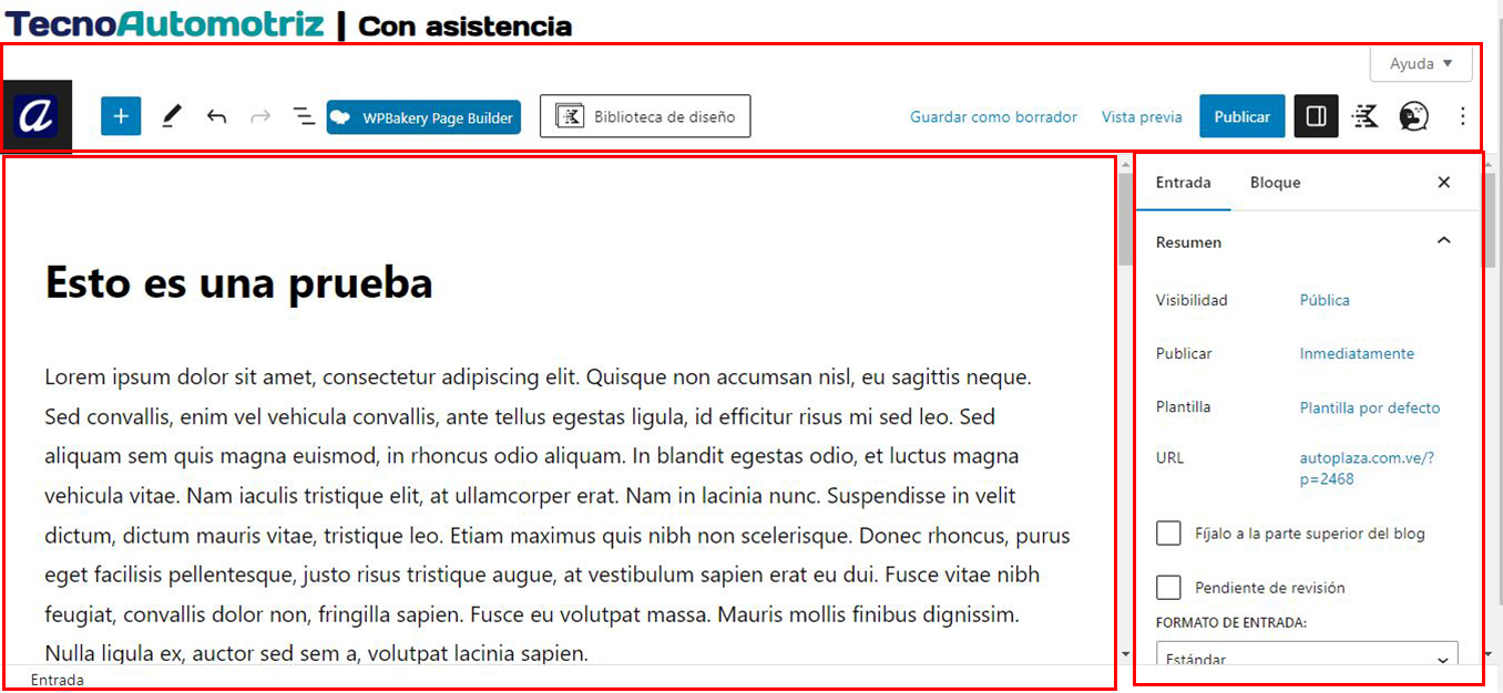 El editor de entradas y páginas está estructurado en 3 secciones principales: