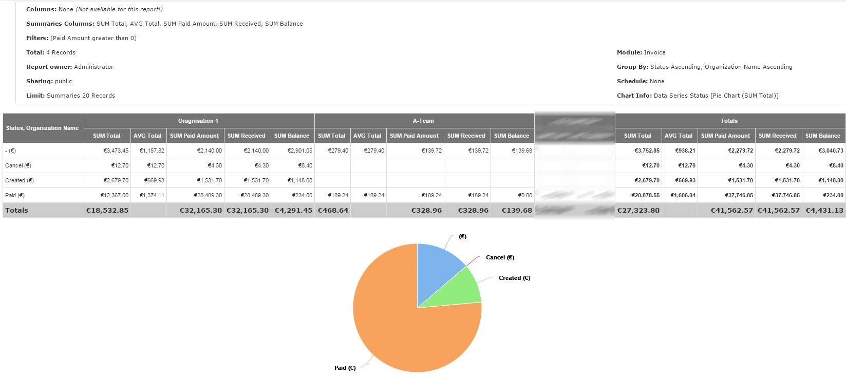 - Informe agrupado por fila: Estado y columna: Nombre de la organización. Con filtro: el monto pagado es mayor que 0.