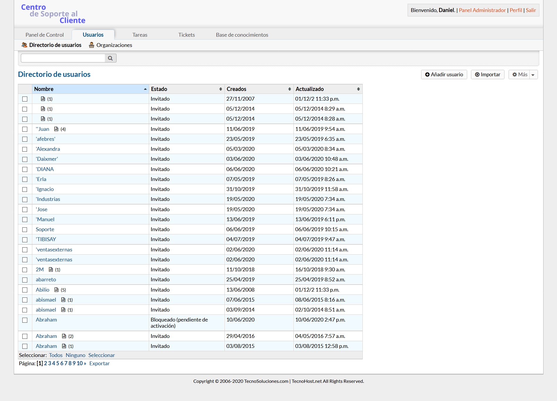 Los usuarios ahora pueden crear una cuenta e iniciar sesión para crear un ticket o verificar el estado de un ticket. Como siempre ocurre con osTicket, los usuarios o creadores de tickets están asociados con su dirección de correo electrónico como el identificador único de cada usuario. El Directorio de usuarios, ubicado en el Panel de agentes, permite a los agentes buscar tickets por usuario, así como crear Organizaciones a las que asociar al usuario. Los agentes se pueden configurar como administradores de cuentas internos para los tickets creados por los usuarios de una organización.
