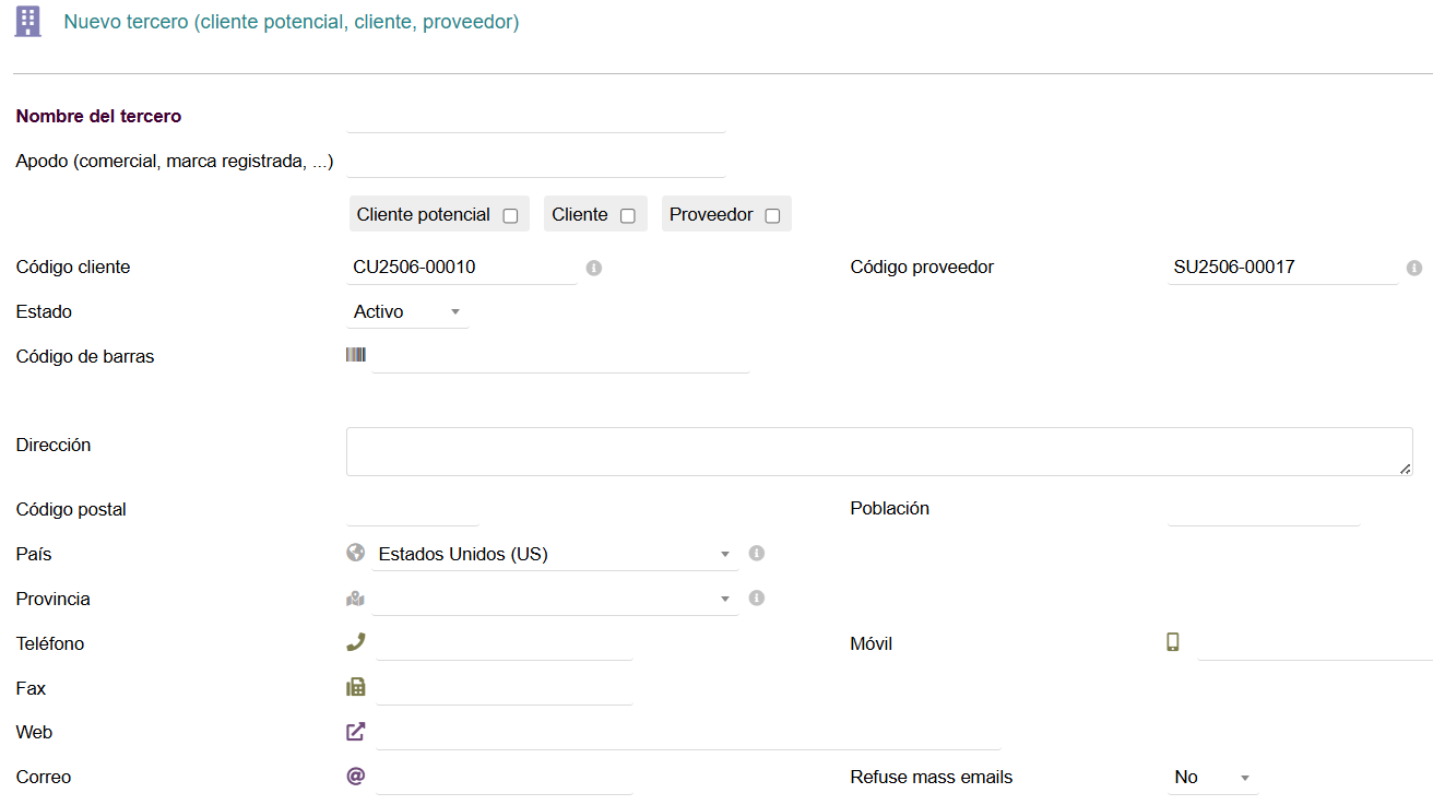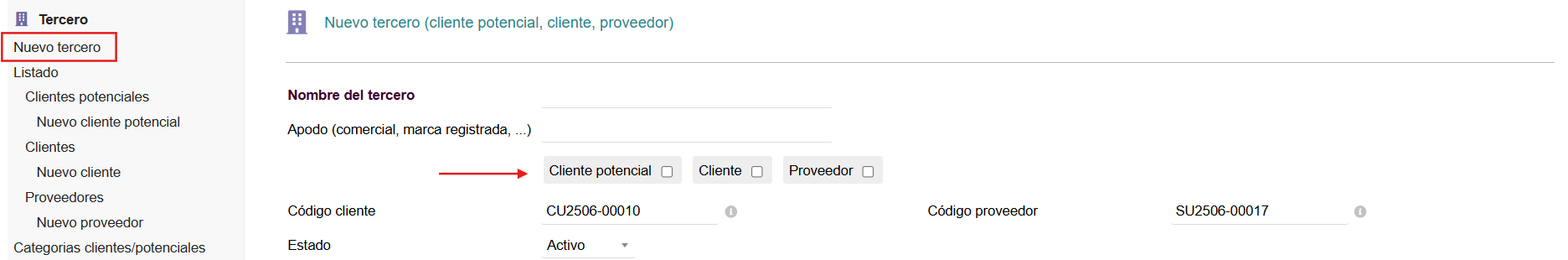 O bien haciendo clic directamente en Nuevo cliente / potencial / proveedor, también en el menú lateral Izquierdo:
