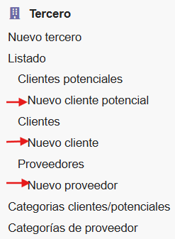 Se pueden crear Terceros de diferentes formas. En el menú lateral Izquierdo, haciendo clic en Nuevo tercero y posteriormente, se debe seleccionar el tipo de cliente dentro de las opciones del formulario: