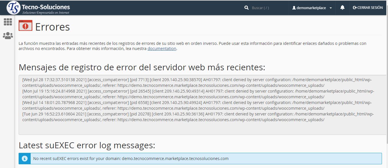 La interfaz incluye entradas en el /usr/local/apache/logs/suexec_logarchivo y el /usr/local/apache/logs/error_logarchivo.