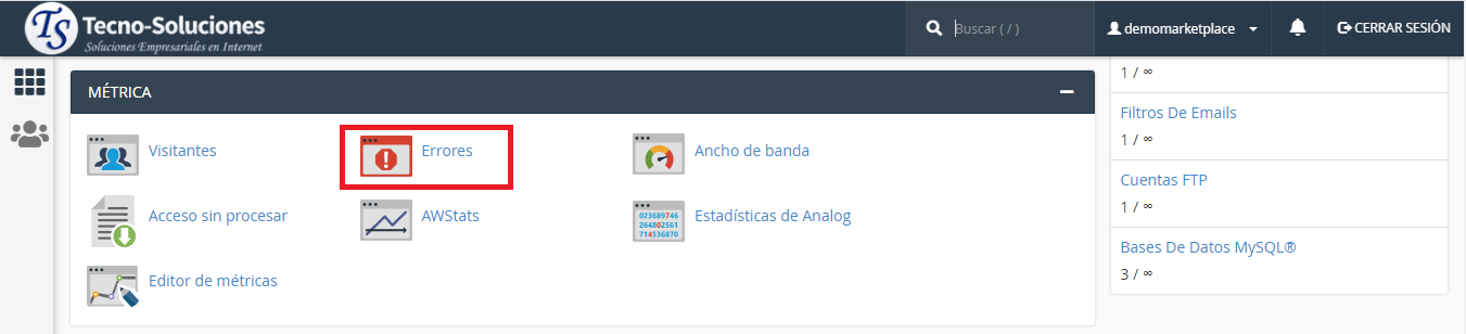 La interfaz muestra las entradas del registro de errores del directorio de inicio del usuario. La interfaz también muestra /usr/local/apache/logs/suexec_logentradas de archivos que incluyen el nombre de usuario de la cuenta.